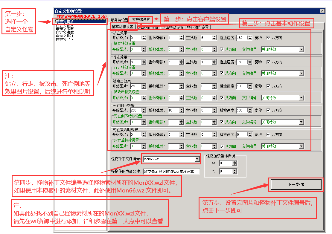1)选择自定义怪物,点击客户端设置,点击基本动作设置,设置怪物的站立、行走、被攻击、死亡等效果图片(下面图片中进行说明),选择怪物补丁文件,最后点击下一步;