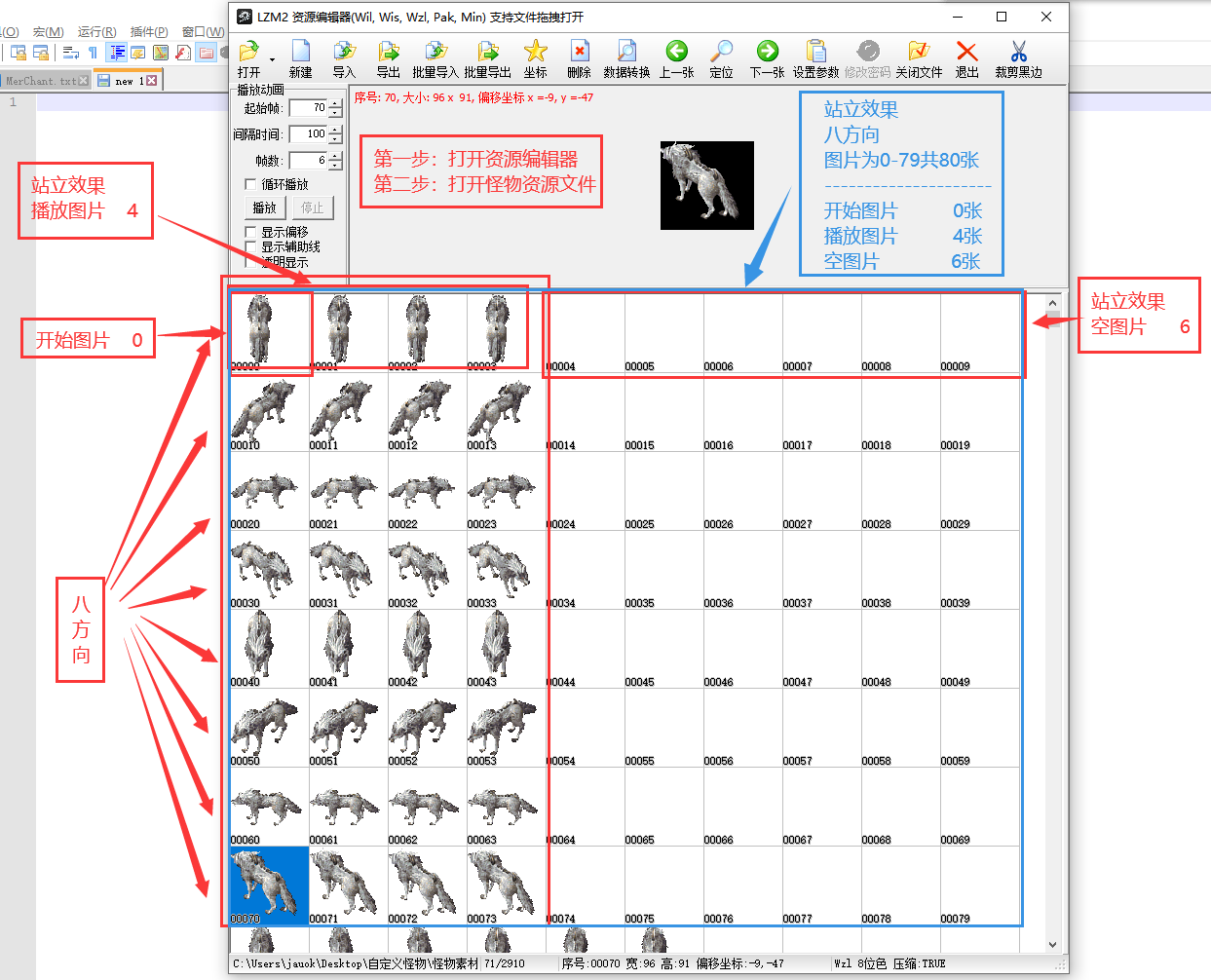 A)站立效果图片设置,根据霜狼在编辑器中的动作,确定0-79为八方向站立效果,开始图片0,其中播放张数4张,空张数6张;