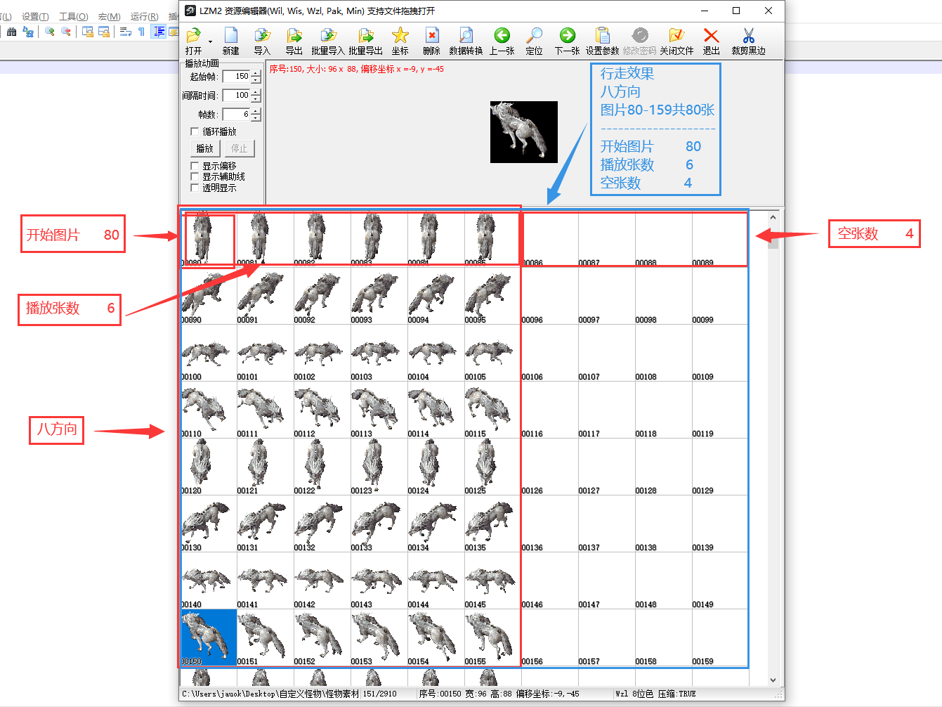 B)行走效果图片设置,根据霜狼在编辑器中的动作,确定80-159为八方向行走效果,开始图片80,其中播放张数6张,空张数4张;