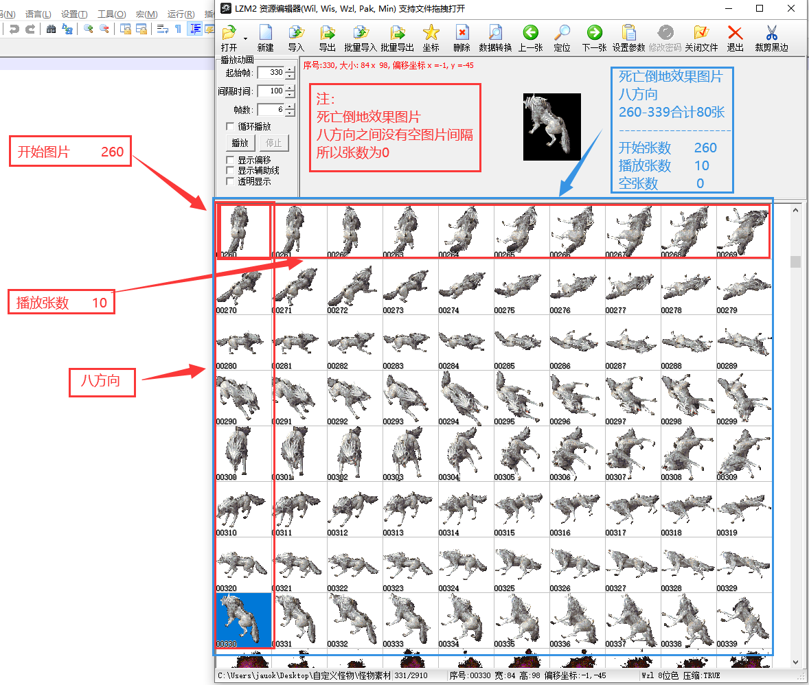 D)死亡倒地效果图片设置,根据霜狼在编辑器中的动作,260-339为八方向被攻击效果,开始图片260,其中播放张数10张,空张数0张;