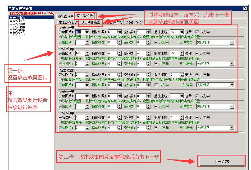 2)基本动作设置设置完成,点击下一步,来到攻击动作设置页面,进行攻击效果图片设置(后续图片说明),设置完成后点击下一步;