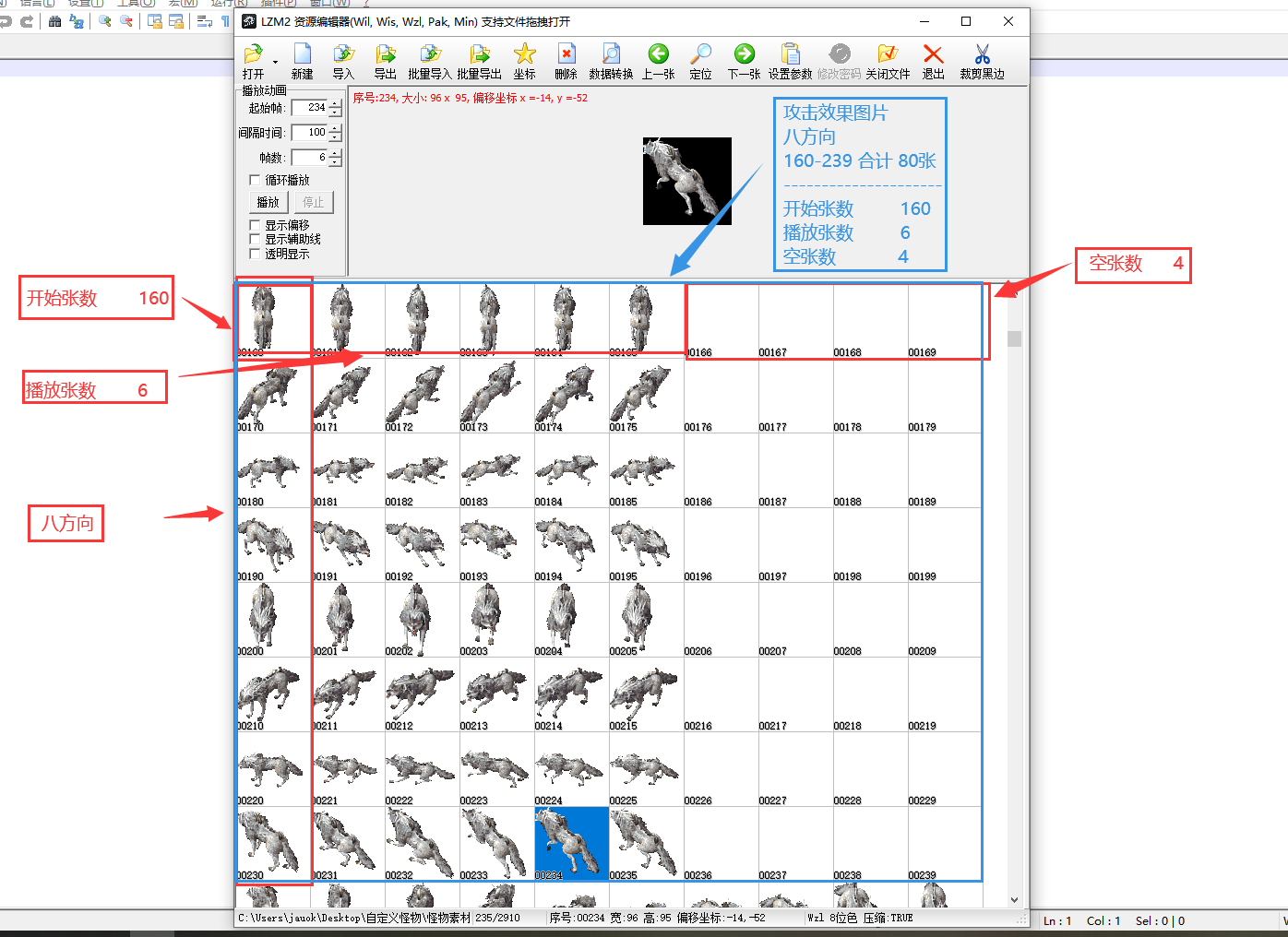 A)攻击效果图片设置,根据霜狼在编辑器中的动作,确定160-239为八方向被攻击效果,开始图片160,其中播放张数6张,空张数4张;