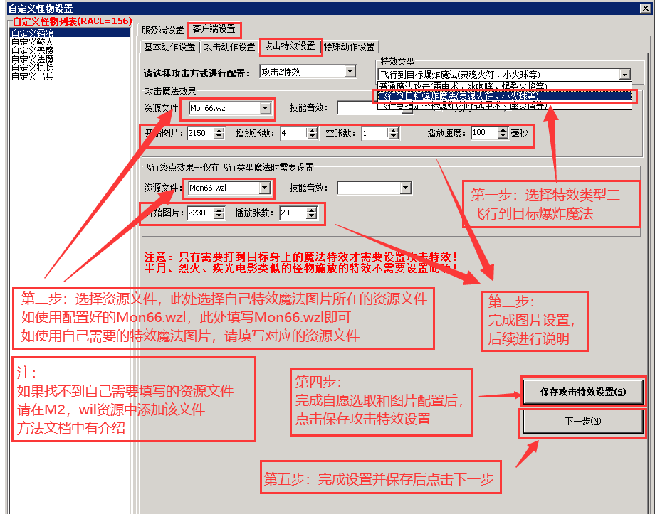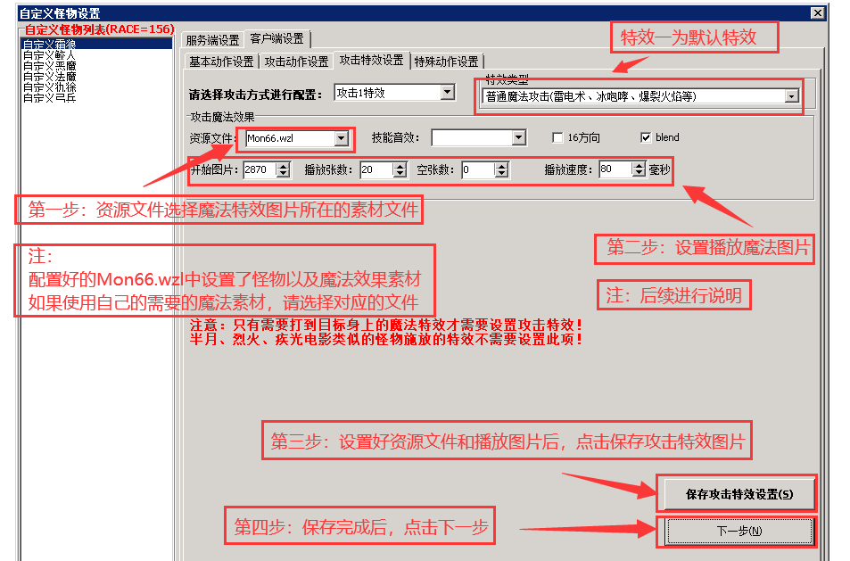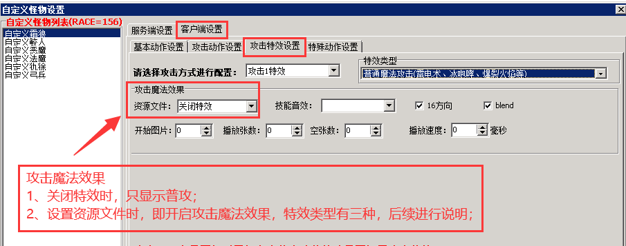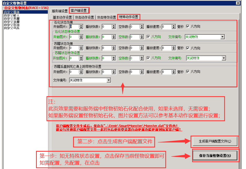 特殊动作设置根据服务端怪物是否勾选石化设置进行配合,如果服务端未设置石化状态此页不需要进行设置。直接点击保存当前怪物设置,然后生成客户端配置文件即可;