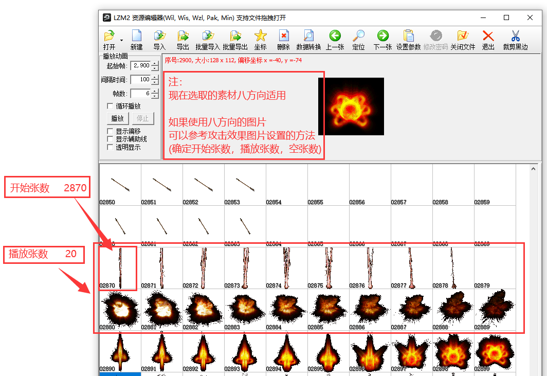 效果分为十六方向、八方向和无方向,本次说明选取的是比较简单的无方向素材,开始图片2870,其中播放张数20张,空张数0张;如果需要设置八方向、十六方向可参照攻击效果图片设置方法进行设置;