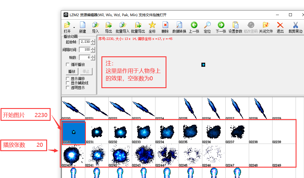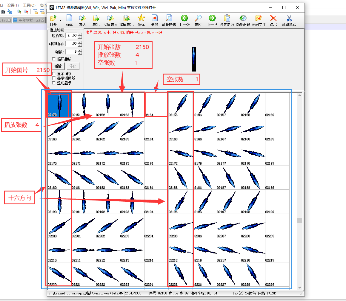 特效二中的攻击魔法效果是飞行过程中的效果,效果分为十六方向、八方向,本次说明选取的是十六方向素材,开始图片2150,其中播放张数4张,空张数1张。如果需要设置八方向可参照十六方向攻击效果图片设置方法进行设置;
