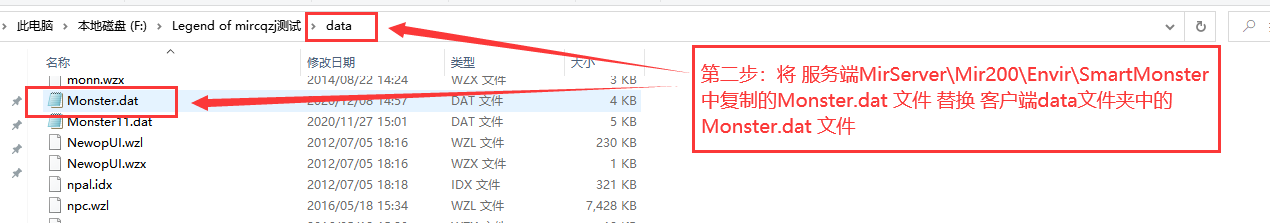4)仅做测试时,将 服务端MirServer\Mir200\Envir\SmartMonster 文件夹下的Monster.dat 复制,替换客户端data文件夹 中的Monster.dat文件即可;
