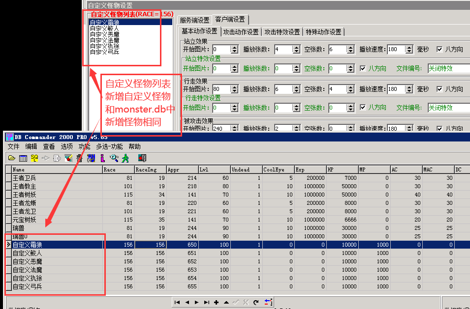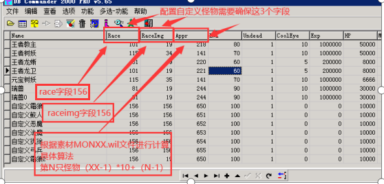 1)在怪物数据库中添加怪物数据,Race编号为156,RaceImg编号为156,Appr为(XX-1)*10+(在MonXX.wil中是第几个怪物-1),其它字段根据自己需要来设定;
