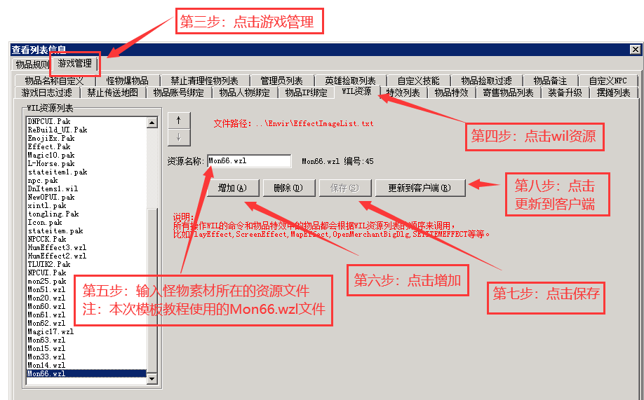 2)点击游戏管理,点击wil资源,新增自定义怪物素材MonXX.Pak或MonXX.Wzl素材文件名即可;