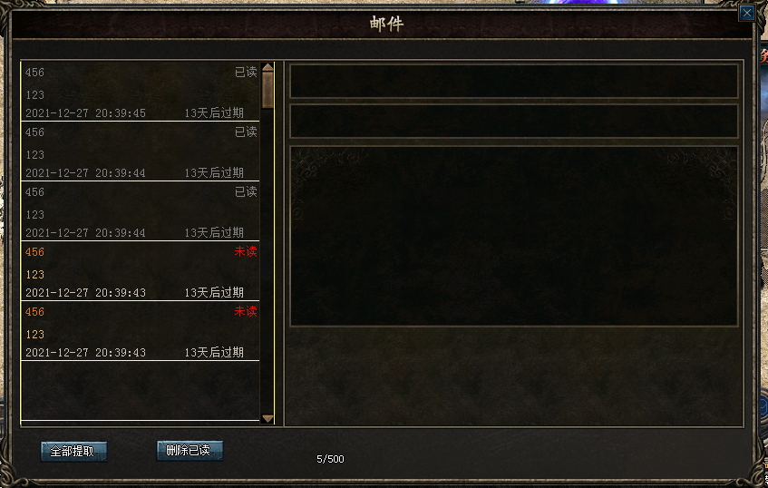 | 参数3 | [限时时间] 0 不限时 大于零为限时时间 如: 7 为限时7日的邮件,7日后邮件将失效,人物上限消失; |
